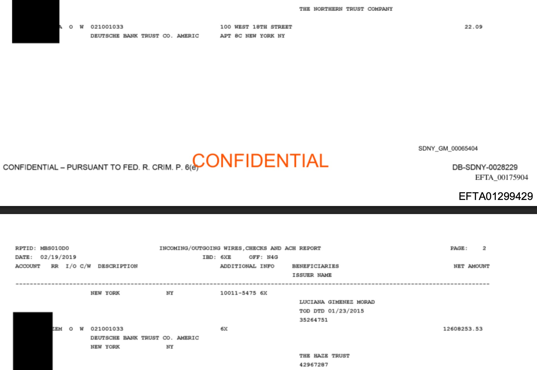 O registro em questão é um “Incoming/Outgoing Wires, Checks and ACH Report”, datado de 19 de fevereiro de 2019, identificado nos autos do SDNY (Distrito Sul de Nova York). Ou seja, um Relatório de Transferências Bancárias (Entrada e Saída), Cheques e Transações ACH (Automated Clearing House), um sistema eletrônico de compensação bancária muito usado nos EUA para transferências entre contas (similar a TED/DOC/PIX no Brasil).