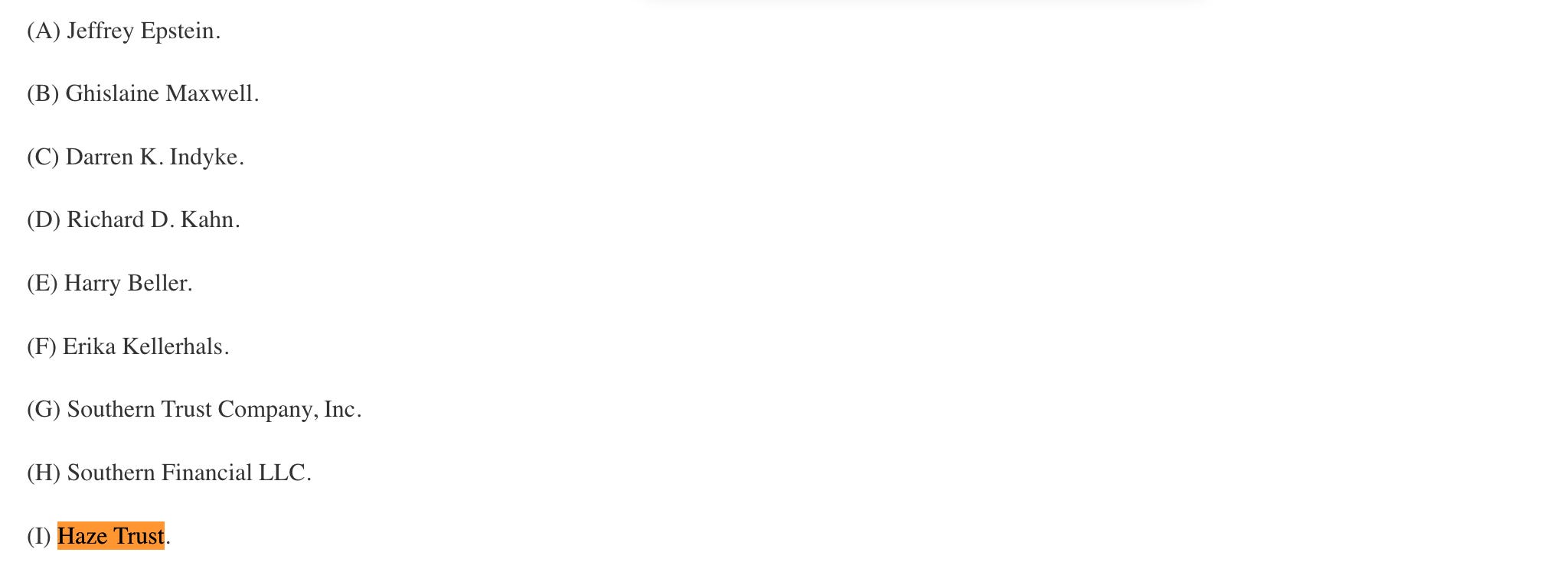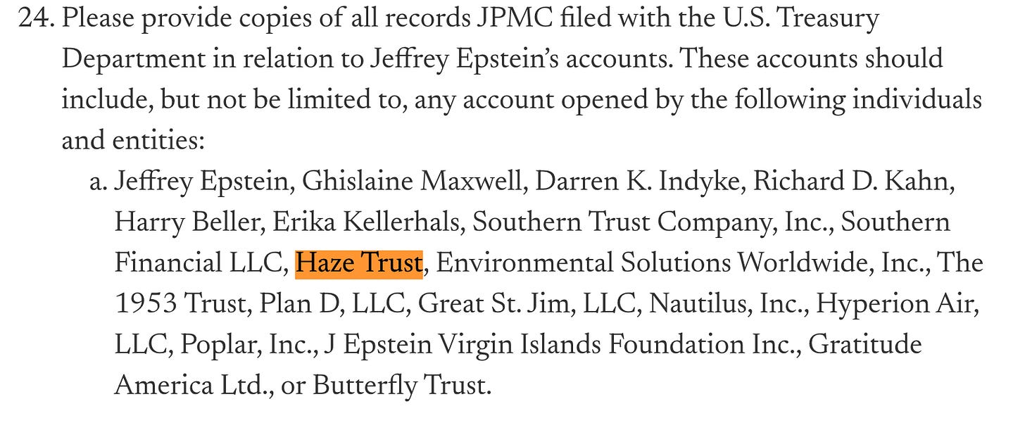 Em uma busca rápida no Google, encontrei documentação legislativa norte-americana no Senado comprovando que a “The Haze” pertece… ao próprio Epstein. Os documentos são petições para que as autoridades e os bancos entreguem movimentações financeiras do criminoso ao Congresso.