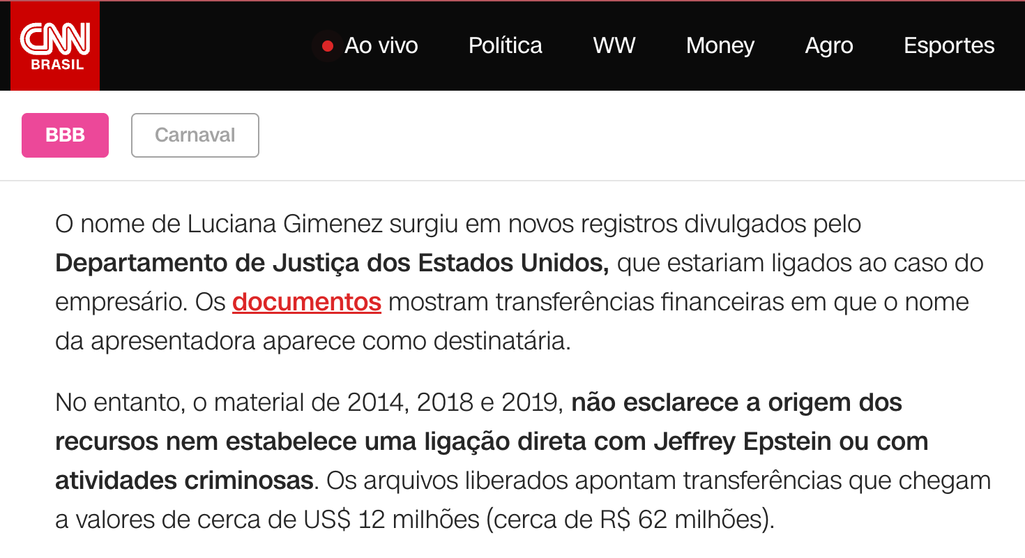 O que a imprensa fez assim que percebeu o nome de Gimenez no arquivo? Errou a interpretação do documento, e atribuiu a ela o recebimento de mais de 12,6 milhões de dólares. Na versão publicada pelos veículos, a fortuna teria sido depositada por Epstein à brasileira. Em uma leitura menos apressada, vê-se claramente que o montante não tinha ido parar nas contas de Gimenez.
