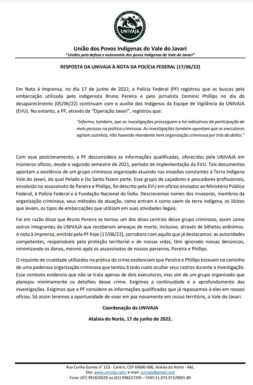A Univaja reforça a apuração dos jornalistas e diz que “a PF desconsidera as informações qualificadas, oferecidas em inúmeros ofícios, desde o segundo semestre de 2021". “Tais documentos apontam a existência de um grupo criminoso organizado atuando nas invasões constantes à Terra Indígena Vale do Javari". Não estamos diante de pescadores amadores.