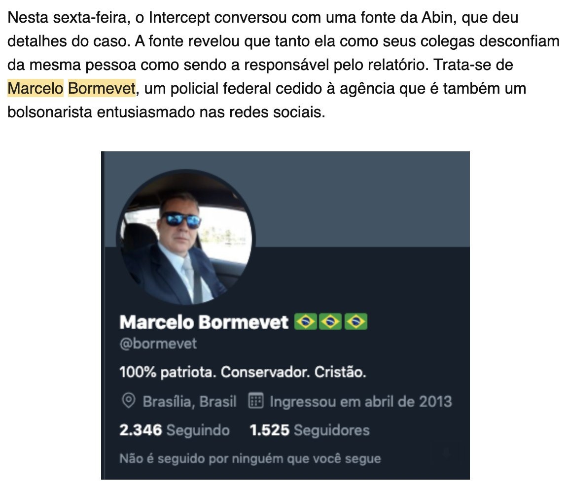 Um dos agentes que sofreu busca e apreensão foi Marcelo Bormevet. Seu nome veio à tona em 2020 quando o Intercept o apontou como sendo o responsável por usar a Abin para ajudar na defesa de Flávio Bolsonaro no caso das rachadinhas.